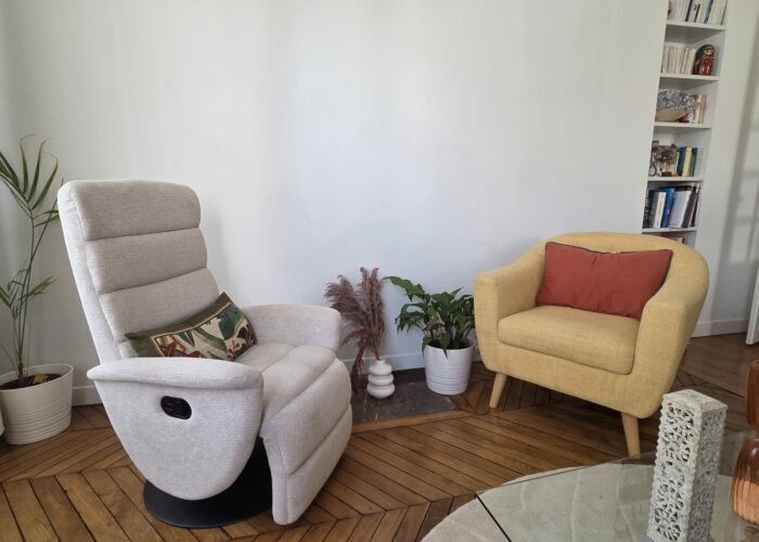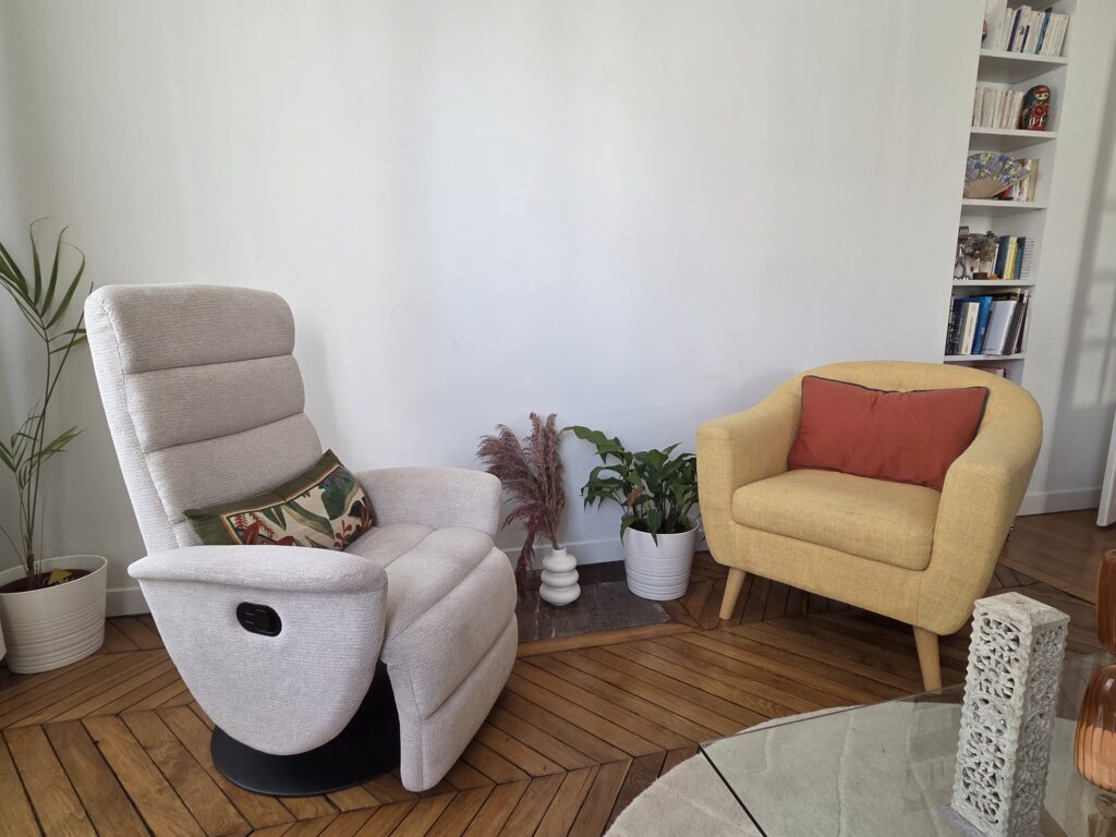 Je vous accueille dans un espace calme et chaleureux, proche du Canal Saint-Martin et des gares, facilement accessible en métro. Un cadre pensé pour vous sentir en sécurité et prendre le temps de déposer ce que vous vivez.